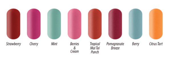 - Flavors: Strawberry, Berries & Cream, Tropical Mai Tai, Mint Cherry, Pomegranate Punch, Berry Breeze, Citrus Tart