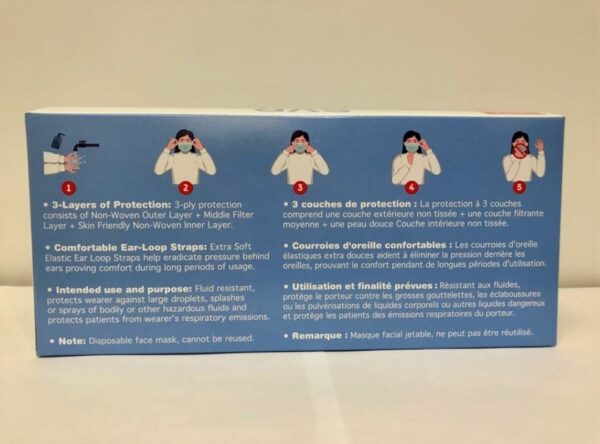 3-Ply surgical mask with a filtration efficiency (BFE) of 98% to 99%. Mask creates a barrier between the mouth/nose of the wearer and potential contaminants in the immediate environment. It also prevents patients from direct trans-