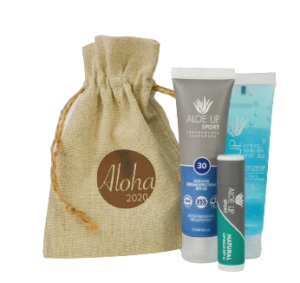 Cosmetic branded bag with Aloe Up Sunscreen, After Sun & Lip Balm